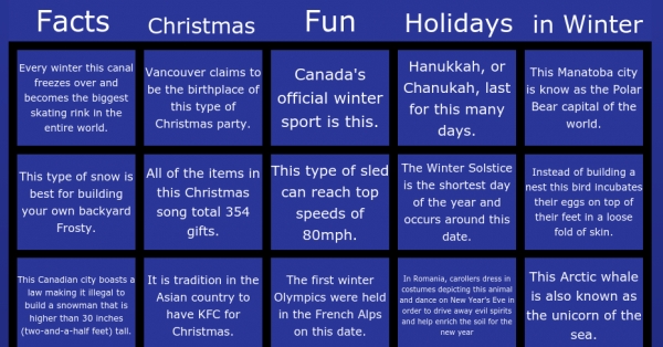 Every winter this canal freezes over and becomes the biggest skating rink in the entire world. , This type of snow is best for building your own backyard Frosty., This Canadian city boasts a law making it illegal to build a snowman that is higher than 30 inches (two-and-a-half feet) tall. , Chionophobia is the fear of this.