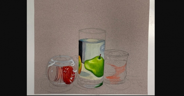 Set up a still life with: at least 2 glass objects 2 pieces of fruit. Place a white background behind the set. steps: 1. sketching - form building, value planning 2. drawing outlines (colored paper) 3. colored pencils